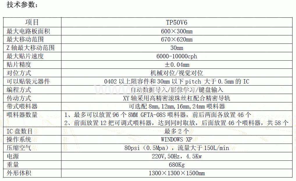 TP 系列貼片機是一款全自動視覺貼片機,它通過真空吸嘴可以貼裝各種元件,是目前市場上性價比高的全自動貼片設備。本產(chǎn)品適合大部份SMD 片狀元件0402, SOIC, PLCC 及QFPIC;配置視覺對中系統(tǒng),滿足高精密度0.5mm 腳距之QFP IC 或BGA 等芯片的貼裝.除標準的圓形基準點外,不絲印焊錫膏的方形的PCB 焊盤和環(huán)型穿孔焊盤,也可作為基準點來識。